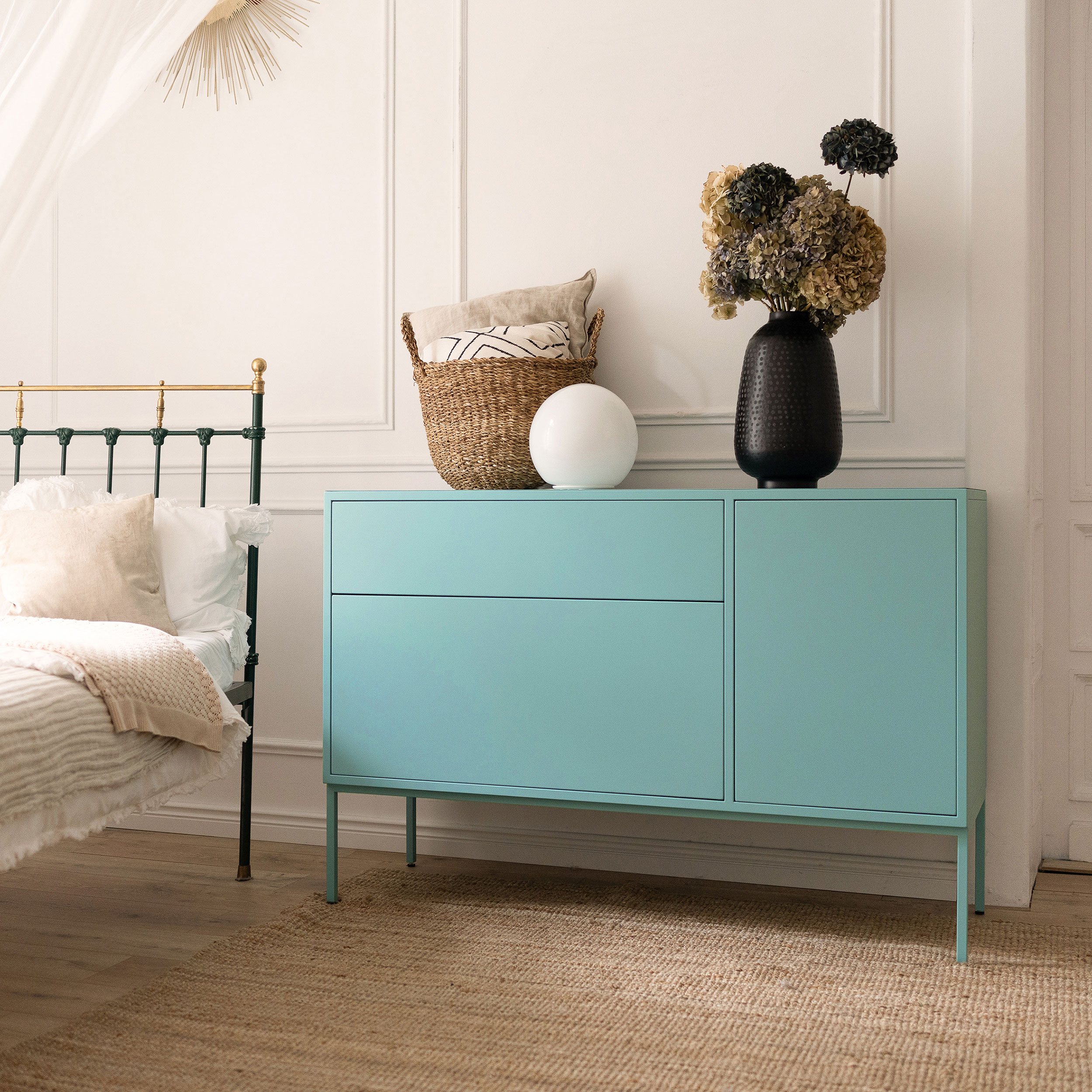 Komoda Arnika 01 została zaprojektowana w taki sposób, by pasować zarówno do pomieszczeń mieszkalnych, jak i biurowych. Będzie pasować zarówno do wnętrza w stylu industrialnym, francuskim jak i vintage. Oprócz nowoczesnego designu, jej niewątpliwym plusem jest pojemność – posiada 2 szuflady oraz 4 pojemne półki, dzięki czemu bez problemu pomieścisz wszystko, czego potrzebujesz. Komoda wykonana jest ze stali i malowana proszkowo, w środku zaś wykończona płytą o delikatnej strukturze tkaniny, co zapewnia nie tylko wysoką jakość, ale też przyjemność dotyku.