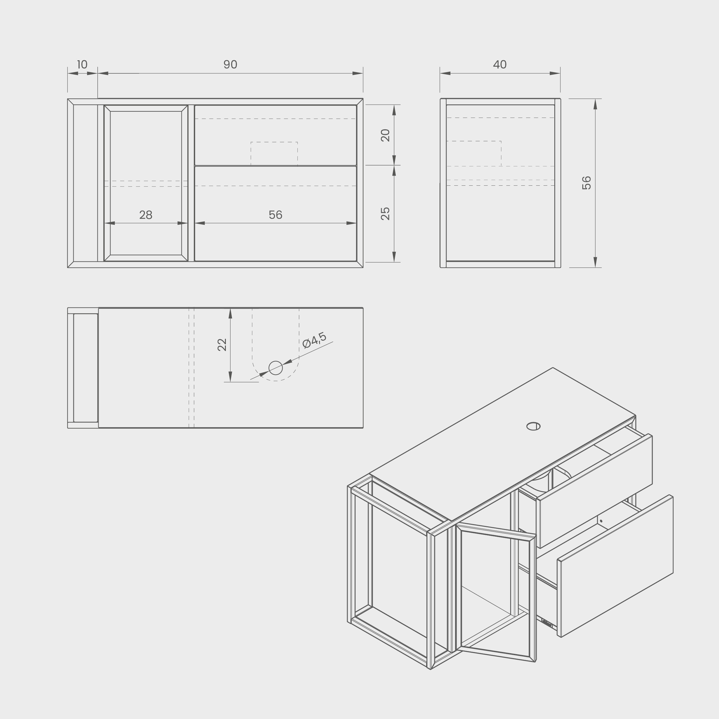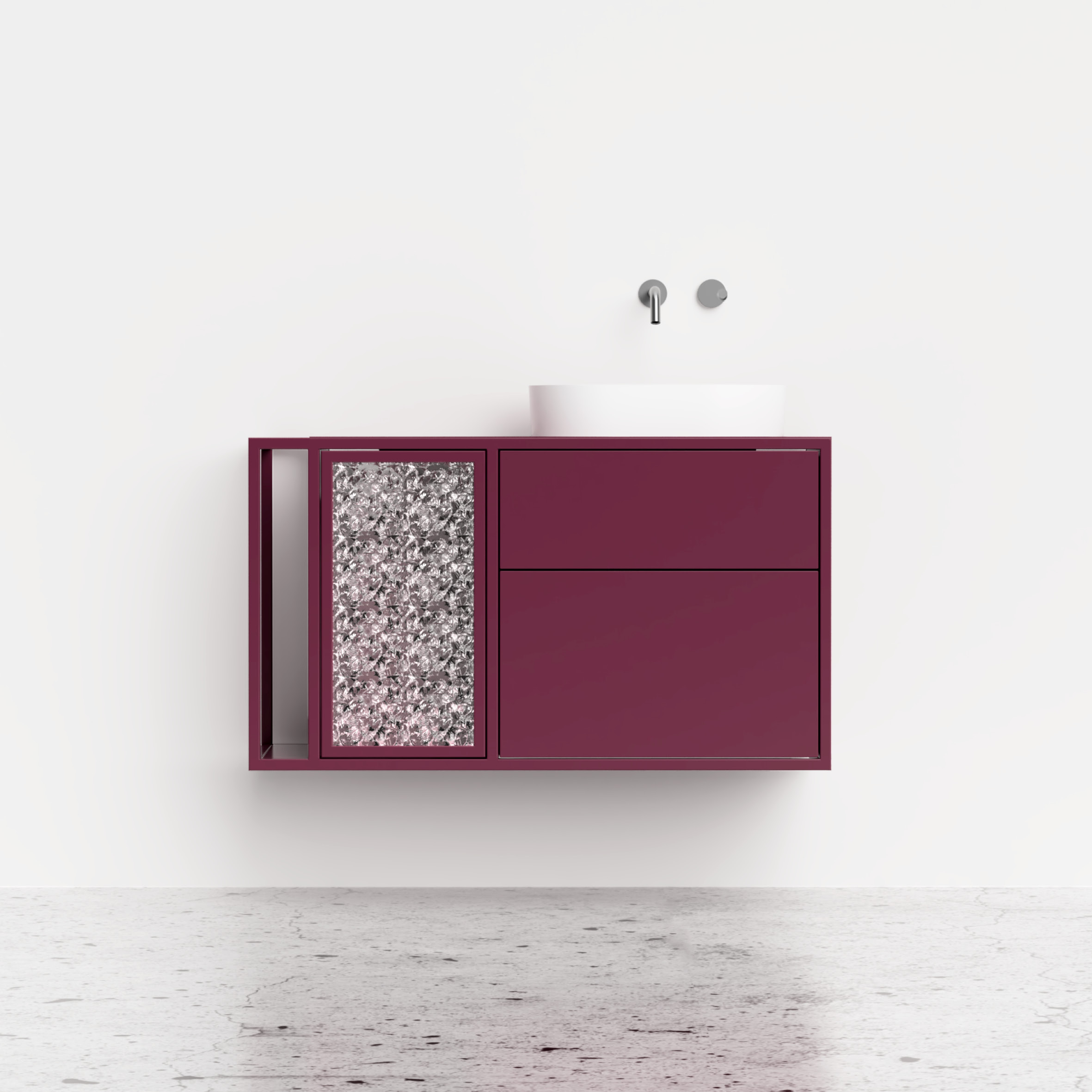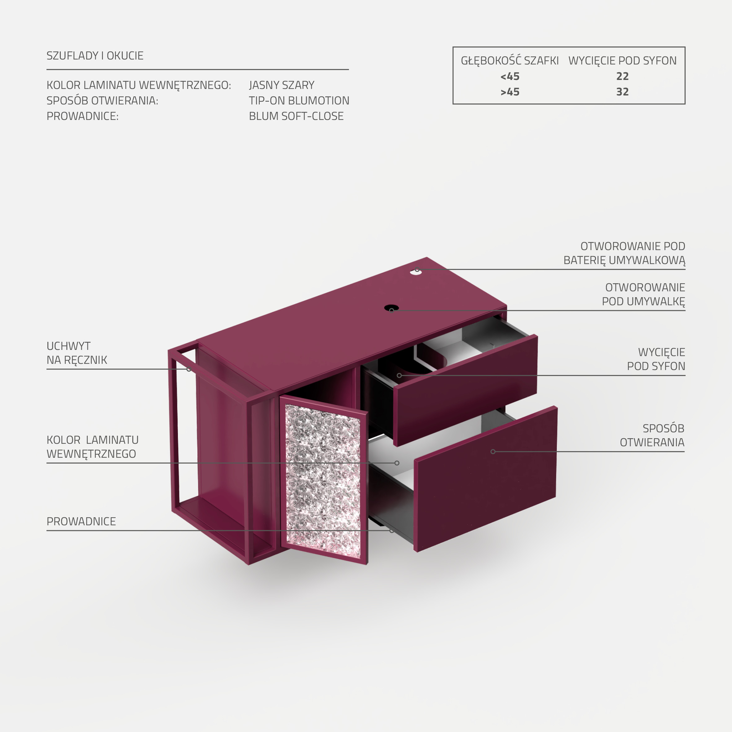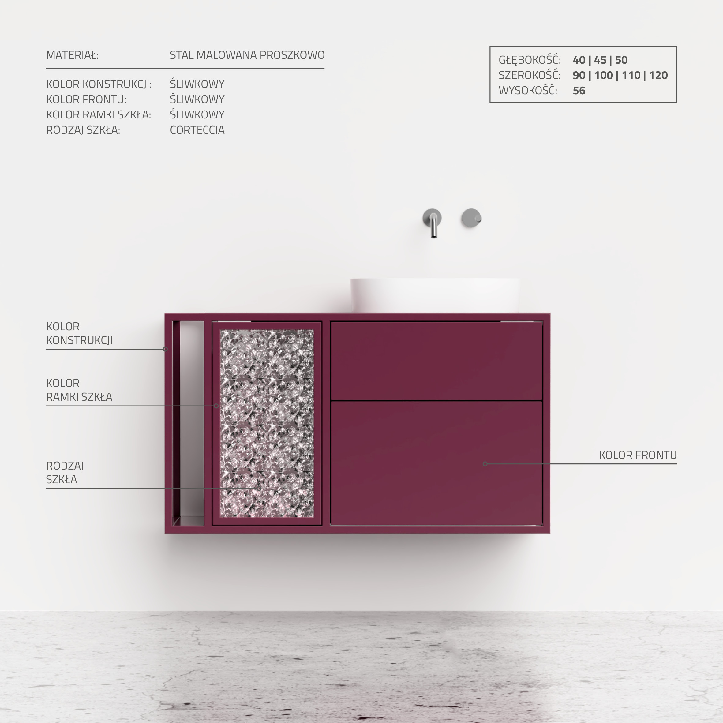 Aurora 01 to elegancka i funkcjonalna szafka łazienkowa. Oferuje dwie przestronne szuflady oraz dodatkową półkę z drzwiczkami ze szkłem, zapewniając efektywne przechowywanie. Szczególnie praktyczny boczny stelaż umożliwia zawieszenie ręcznika, a dodatkowa półeczka doskonale sprawdza się do większych kosmetyków. Szafka Aurora 01, wyprodukowana z najwyższej jakości stali malowanej proszkowo, gwarantuje odporność na wilgoć, zapewniając trwałość i łatwość w utrzymaniu. Zawieszki CAMAR 807 umożliwiają proste mocowanie oraz bezpieczne wsparcie ciężaru do 240kg, zapewniając tym samym doskonałą stabilność.