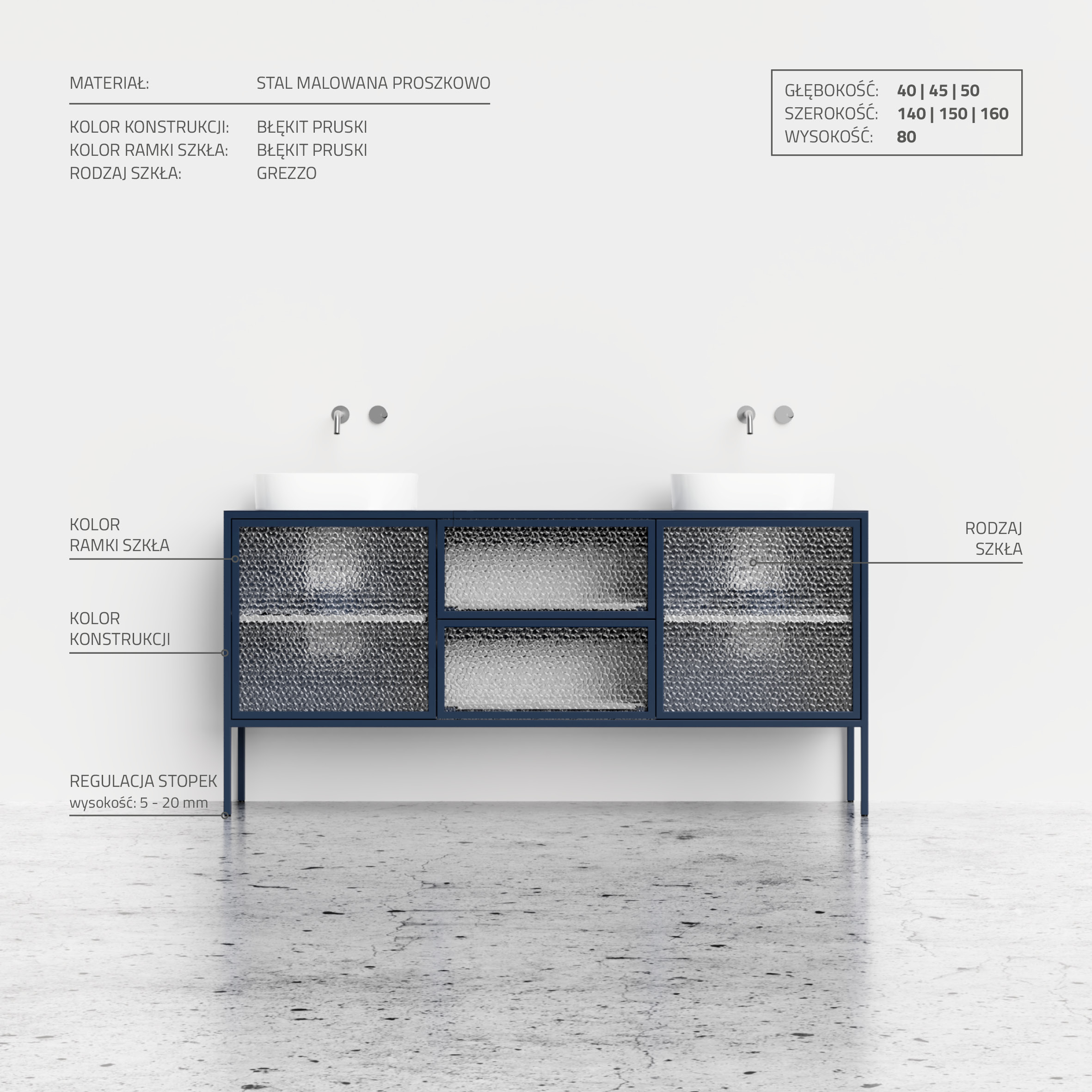 Butomus 01 to kwintesencja luksusu i funkcjonalności w jednym. Z dwiema wbudowanymi umywalkami jest idealnym rozwiązaniem dla tych, którzy cenią sobie komfort i przestrzeń. Dwie pojemne szuflady oraz cztery półki, wszystkie z frontami z ornamentowego szkła, oferują mnóstwo miejsca na przechowywanie. Szafka została wykonana z wysokiej jakości stali, malowanej proszkowo, co gwarantuje jej odporność na wilgoć i długowieczność. Szafka nie puchnie pod wpływem wody oraz jest niezwykle łatwa w utrzymaniu w czystości. Butomus 01 to doskonały wybór dla tych, którzy poszukują elegancji połączonej z trwałością.