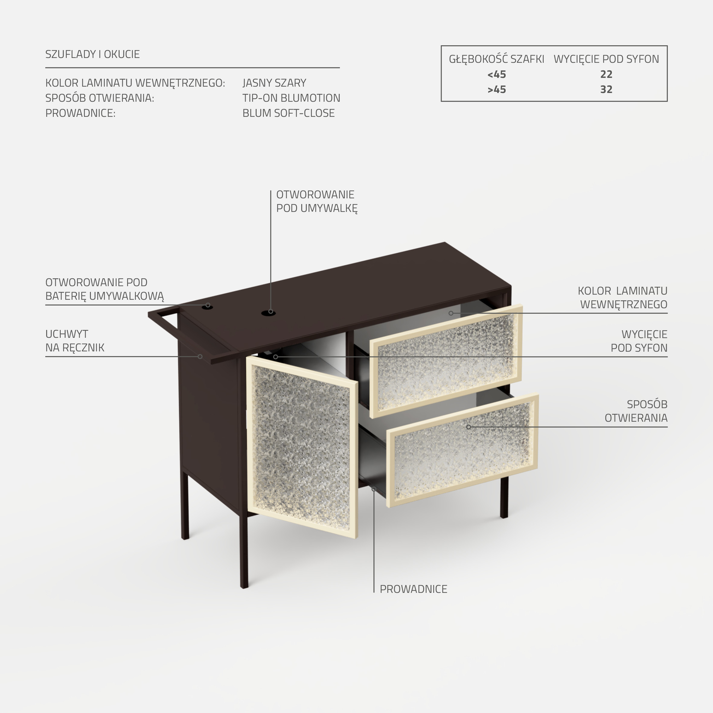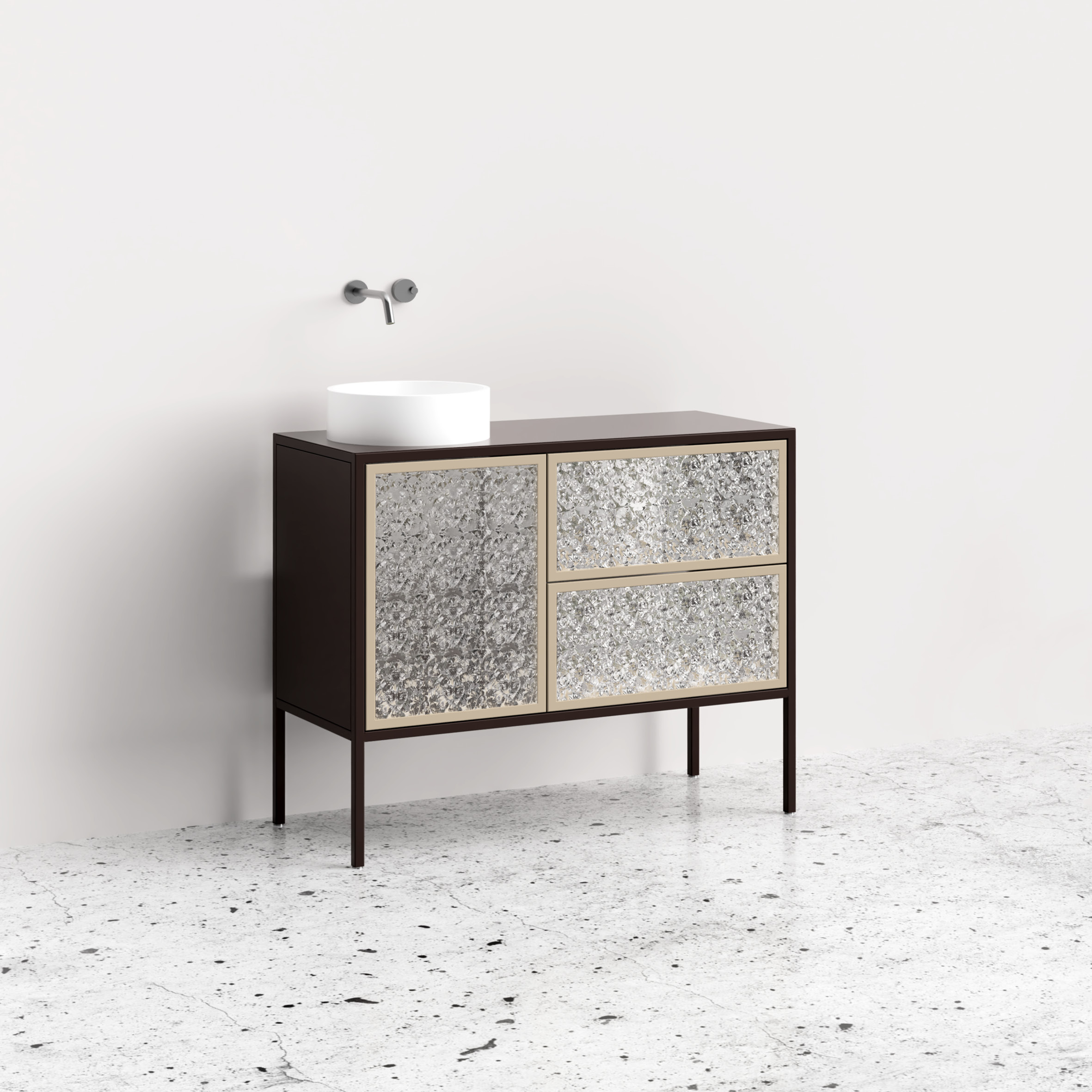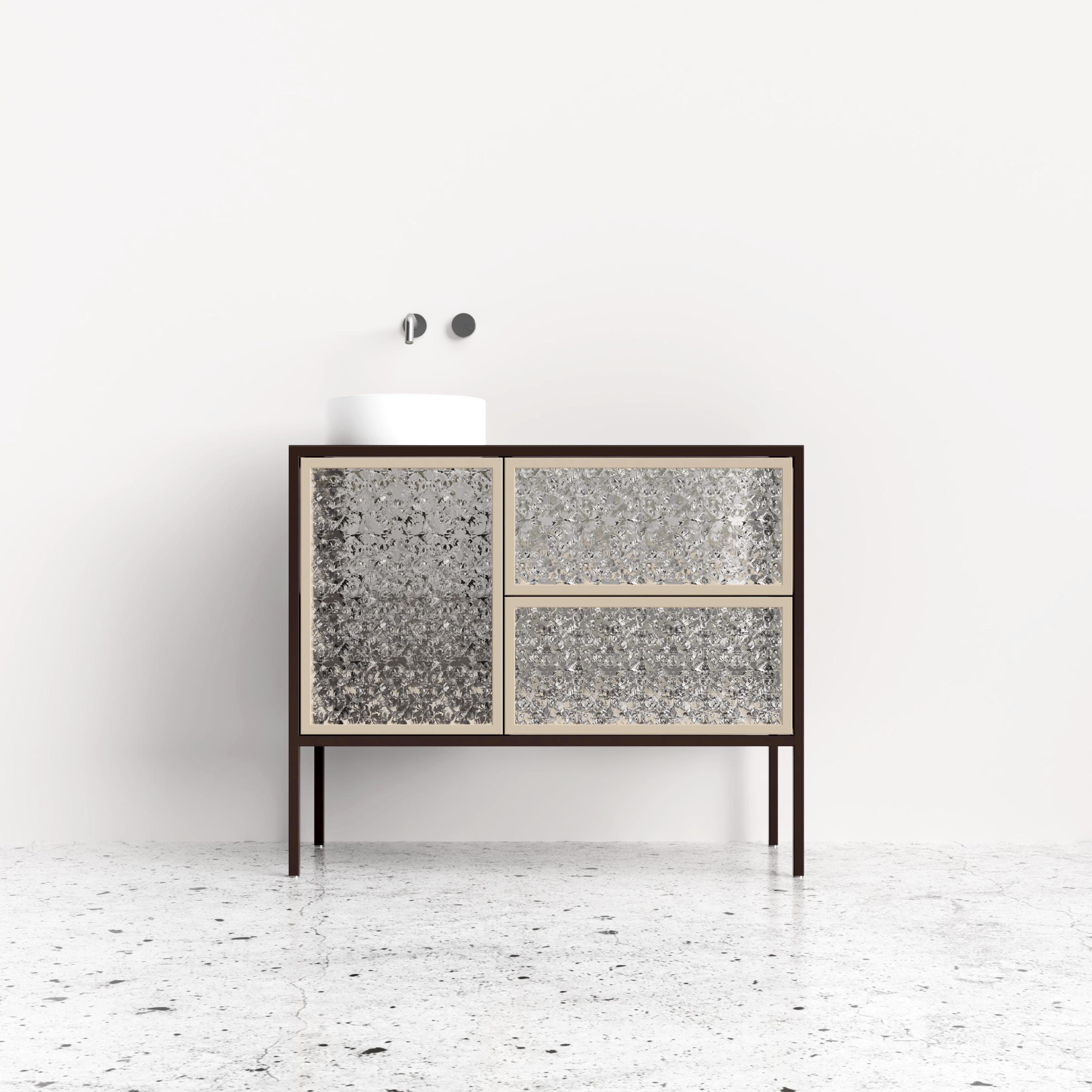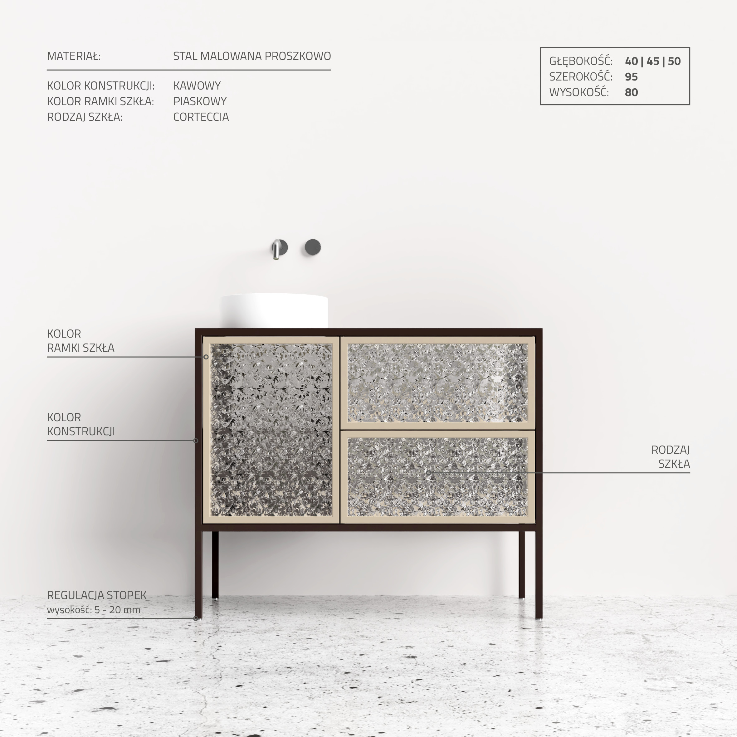 Elodea 02 to wyjątkowa stojąca szafka łazienkowa, łącząca styl z funkcjonalnością. Posiada dwie pojemne szuflady z ornamentowym szkłem na cichy domyk oraz dwie półki za szkłem z zamknięciem tip-on. Wykonana z odpornej na wilgoć stali malowanej proszkowo, gwarantuje trwałość i odporność na wilgoć. Ponadto, szafka jest łatwa w utrzymaniu czystości. Dzięki specjalnemu wykończeniu, nie plami się i nie odbarwia, co pozwala na zachowanie ich nienagannego wyglądu przez długi czas. Jej przestronny blat zapewnia dodatkowe miejsce do przechowywania. Perfekcyjne wykończenie i praktyczność w jednym.