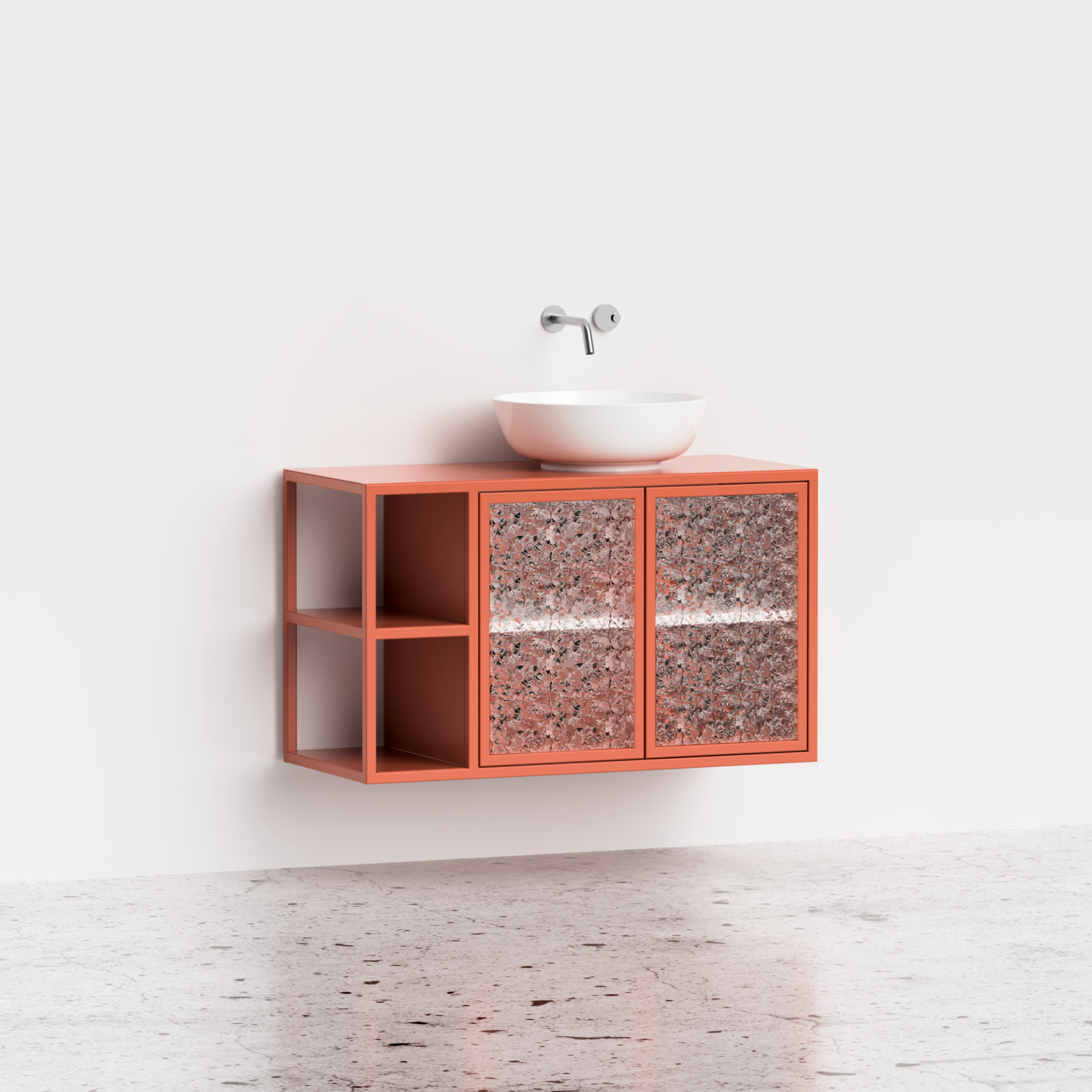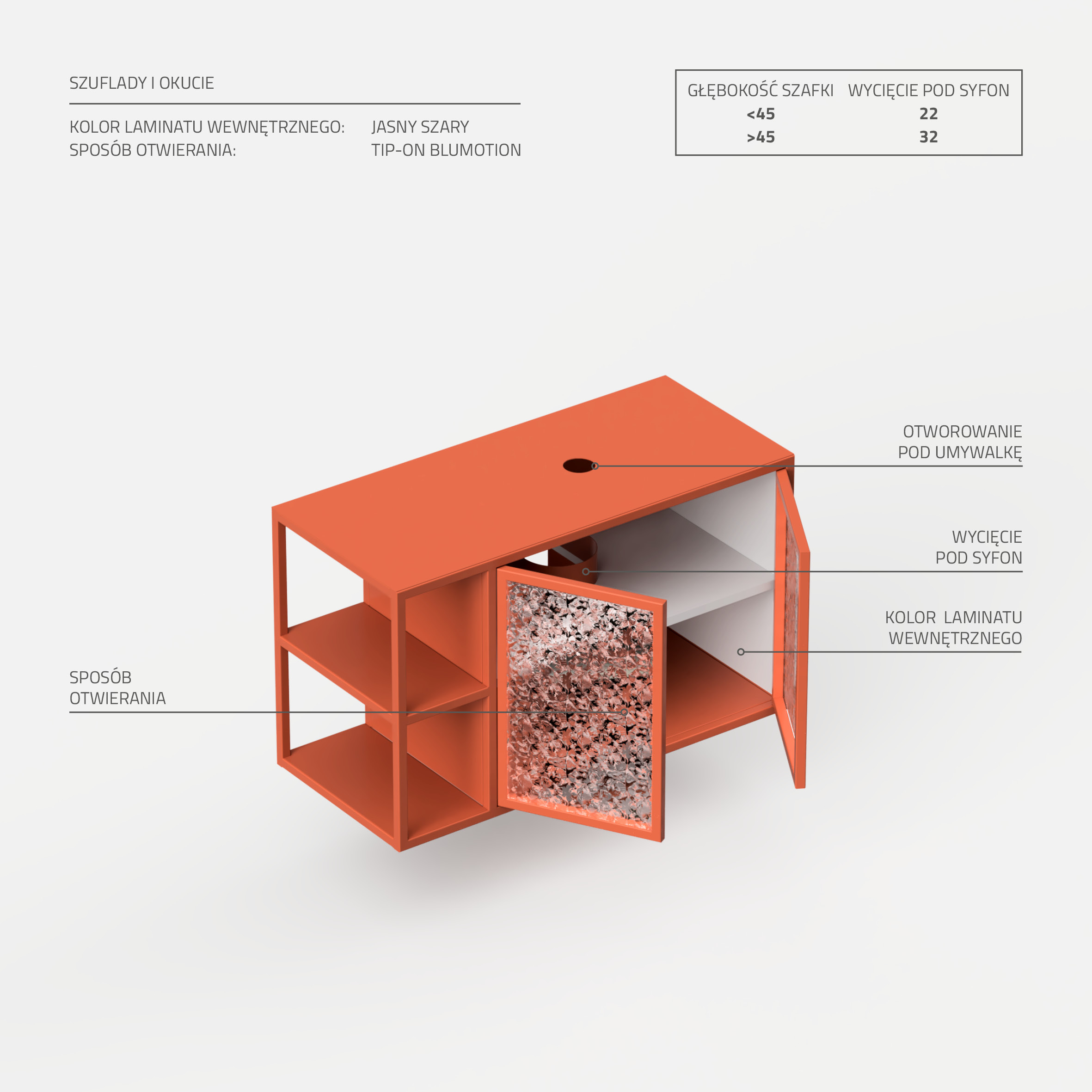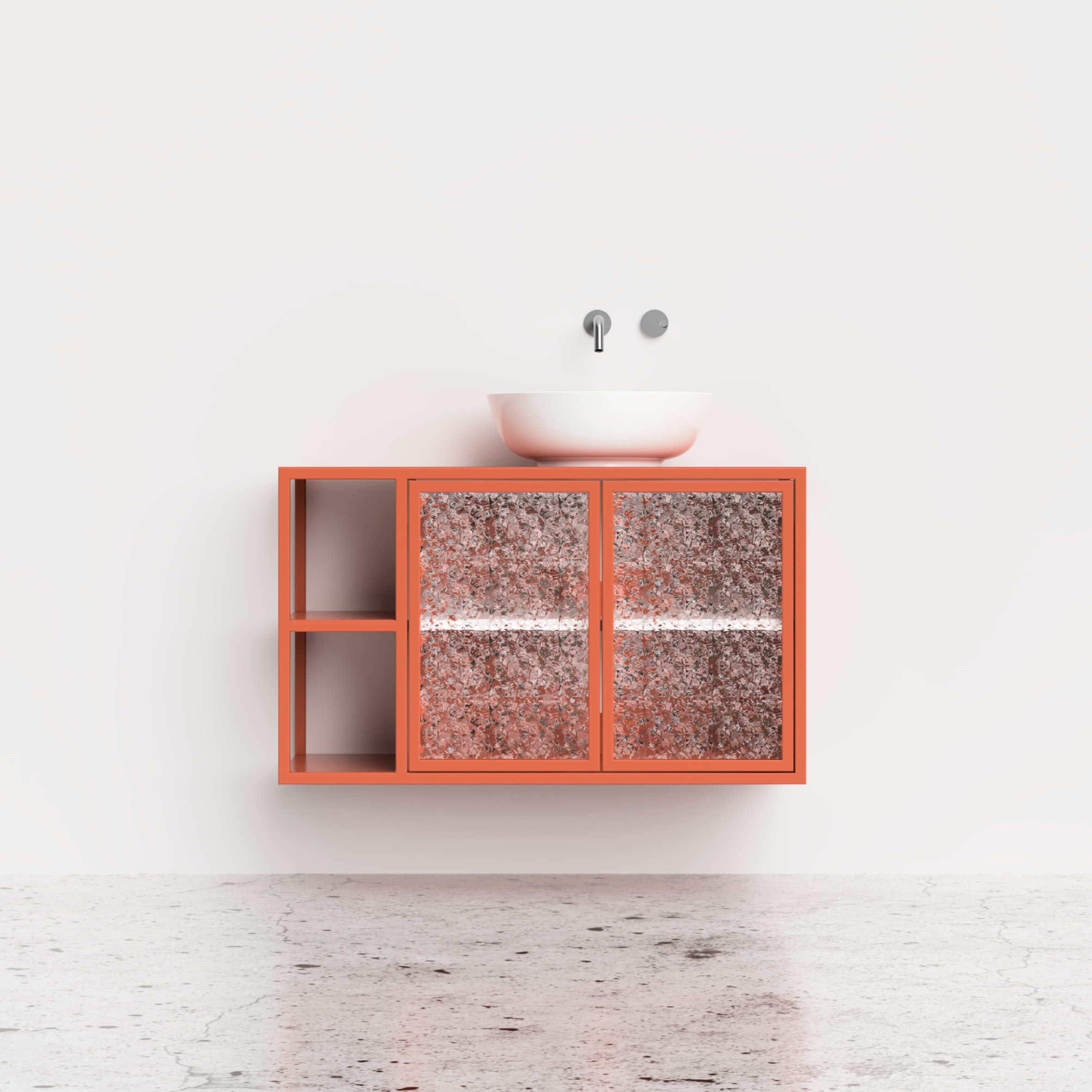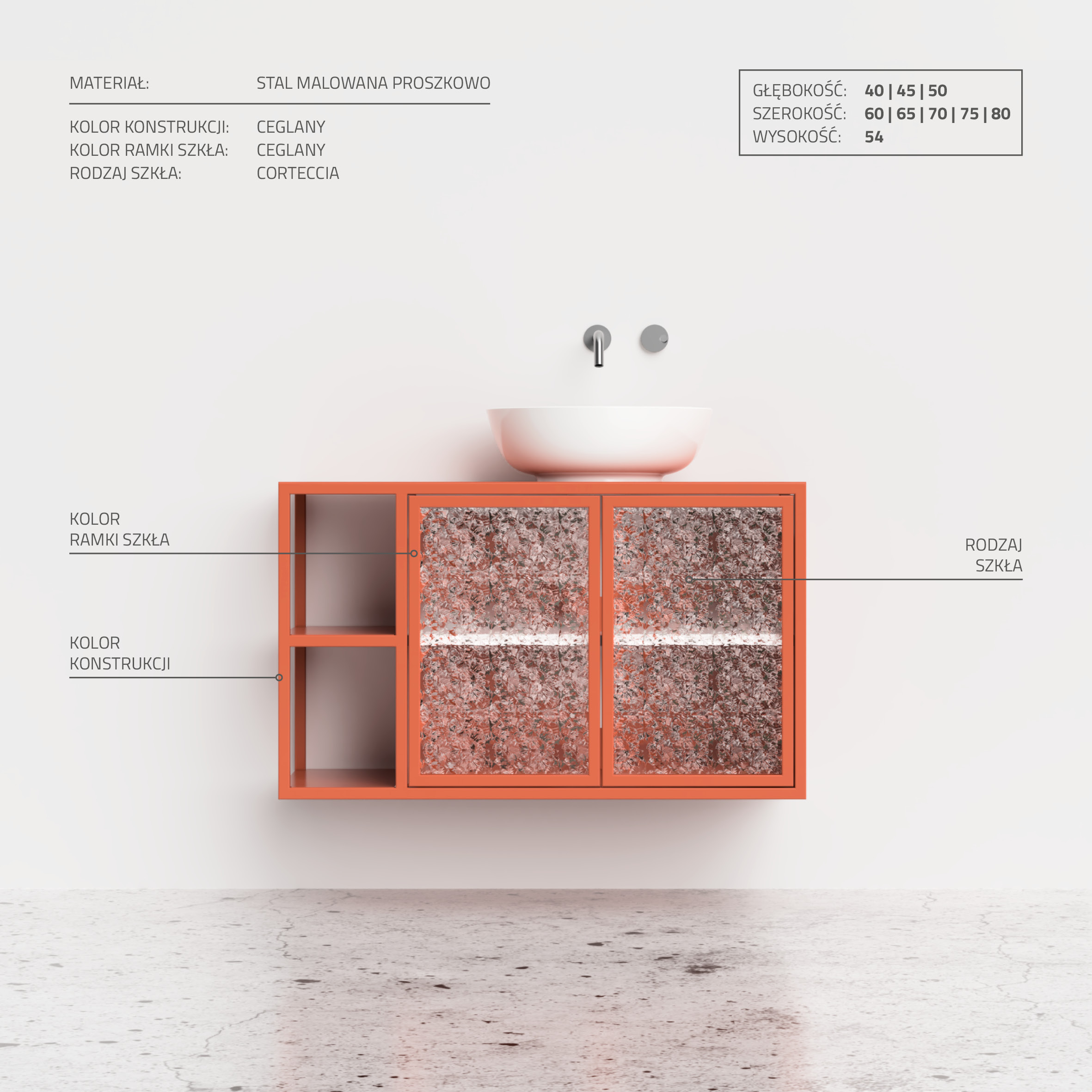 Szafka umywalkowa Clyceria 01 to harmonijne połączenie stylu i praktyczności w Twojej łazience. Otwarte boczne półki oraz szafka z drzwiczkami ze szkłem ornamentowym tworzą miejsce na wyeksponowanie przedmiotów. Duży blat obok umywalki ułatwia organizację przestrzeni. Nasza wysokiej jakości farba proszkowa zapewnia trwałość i estetykę. Montaż na zawieszkach CAMAR 807 (udźwig 240 kg) gwarantuje solidność i bezpieczeństwo. Szafki Clyceria są odporne na wilgoć, nie puchną pod wpływem wody, nie plamią się i nie odbarwiają. Ich łatwość utrzymania w czystości sprawia, że prezentują się zawsze świetnie.