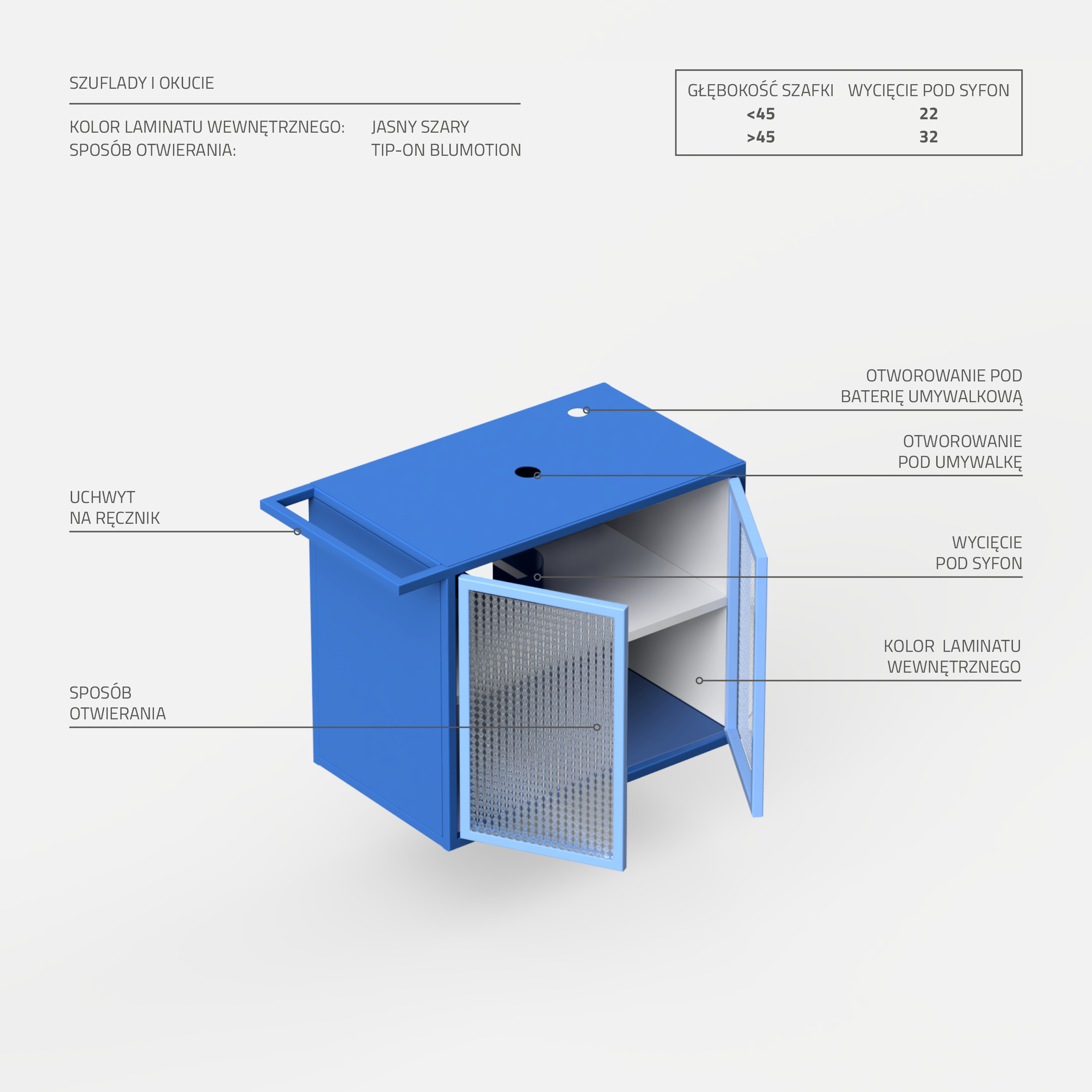 Szafka jest otwierana na dwie strony, z drzwiczkami wykończonymi szkłem ornamentowym. Dzięki temu wygląda absolutnie nietuzinkowo i może pełnić rolę ozdobnej komody łazienkowej. Dodatkowo możesz indywidualnie dopasować wygląd mebla, by pasował do wnętrza.