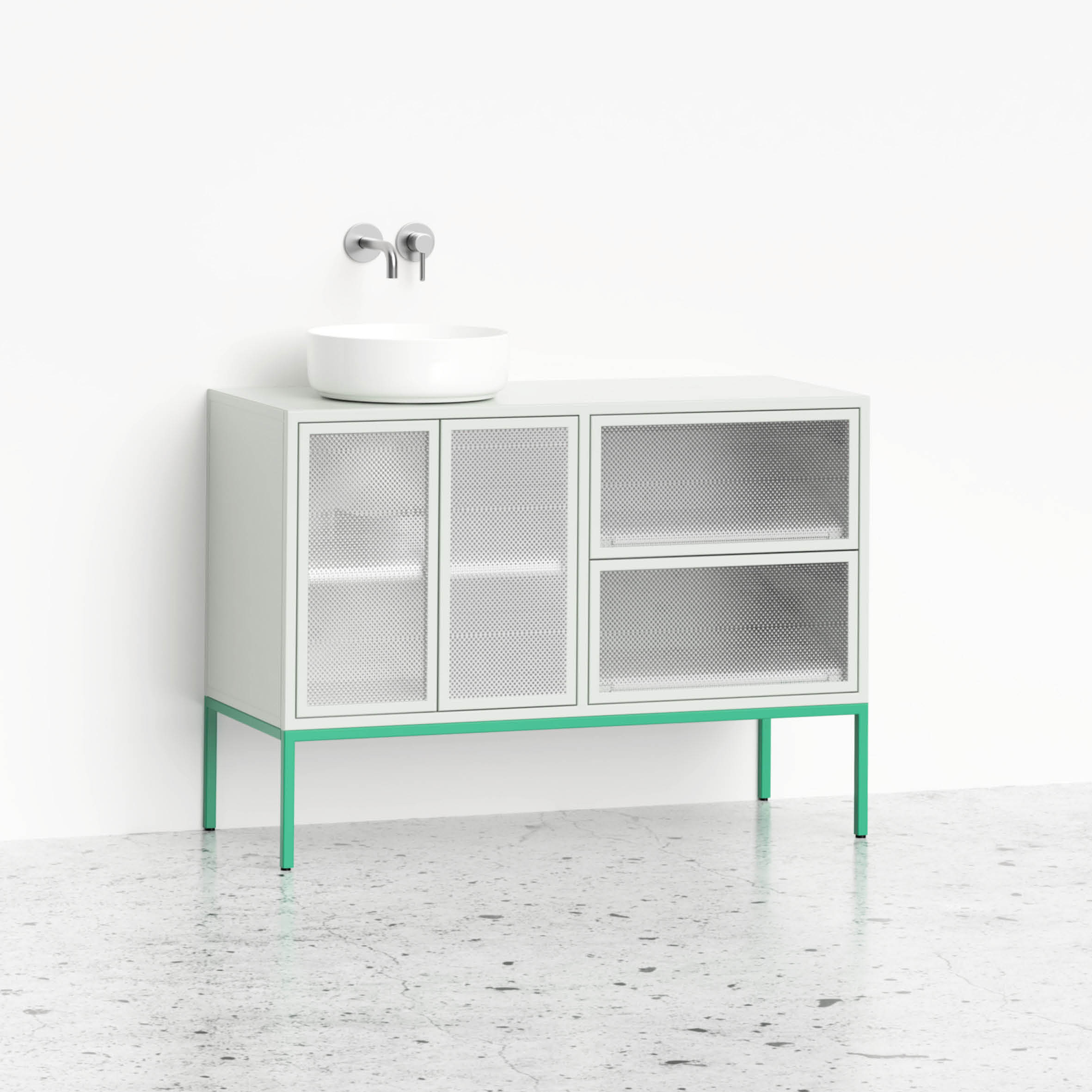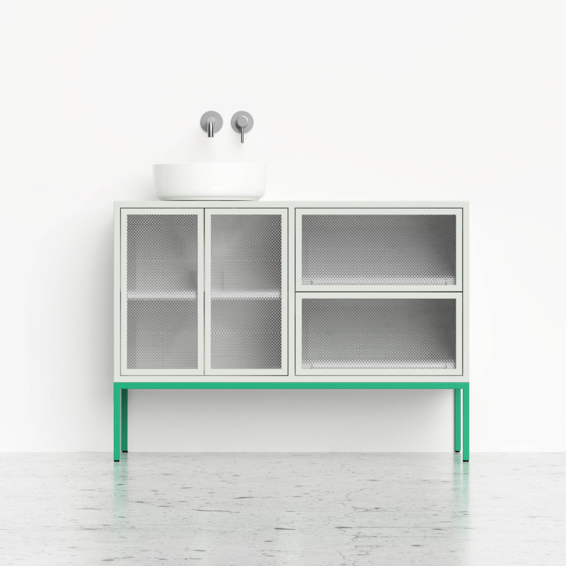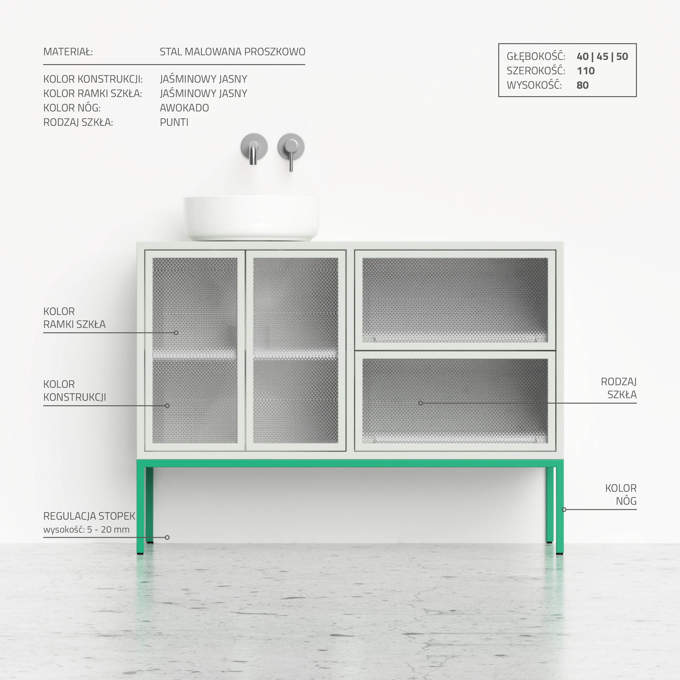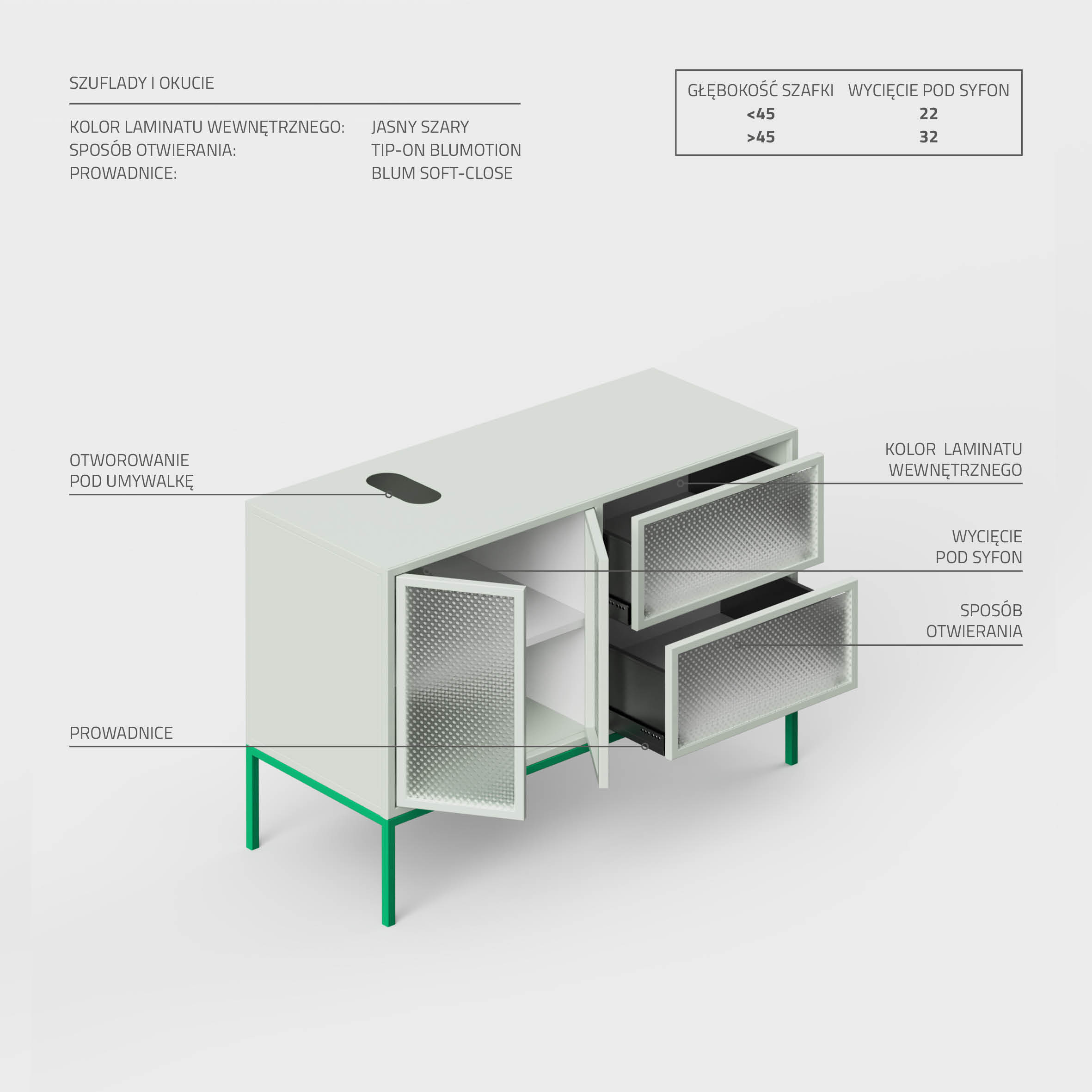 Molinia 02 to szafka łazienkowa, która łączy w sobie funkcjonalność i estetykę. Jej konstrukcja opiera się na solidnej stali malowanej proszkowo, co zapewnia nie tylko elegancki wygląd, ale także odporność na wilgoć i długotrwałość. Zarówno obszerny blat, jak i dwie stylowe szuflady ze zdobionym szkłem ornamentowym pozwalają na twórcze zagospodarowanie przestrzeni. Dodatkowo, praktyczna półka oraz dwustronnie otwierane drzwiczki ze szkłem dodają szafce funkcjonalności. Dodatkowym atutem jest łatwość w utrzymaniu czystości, ponieważ szafka nie plami się i nie odbarwia. Molinia 02 to idealny wybór do łazienki.