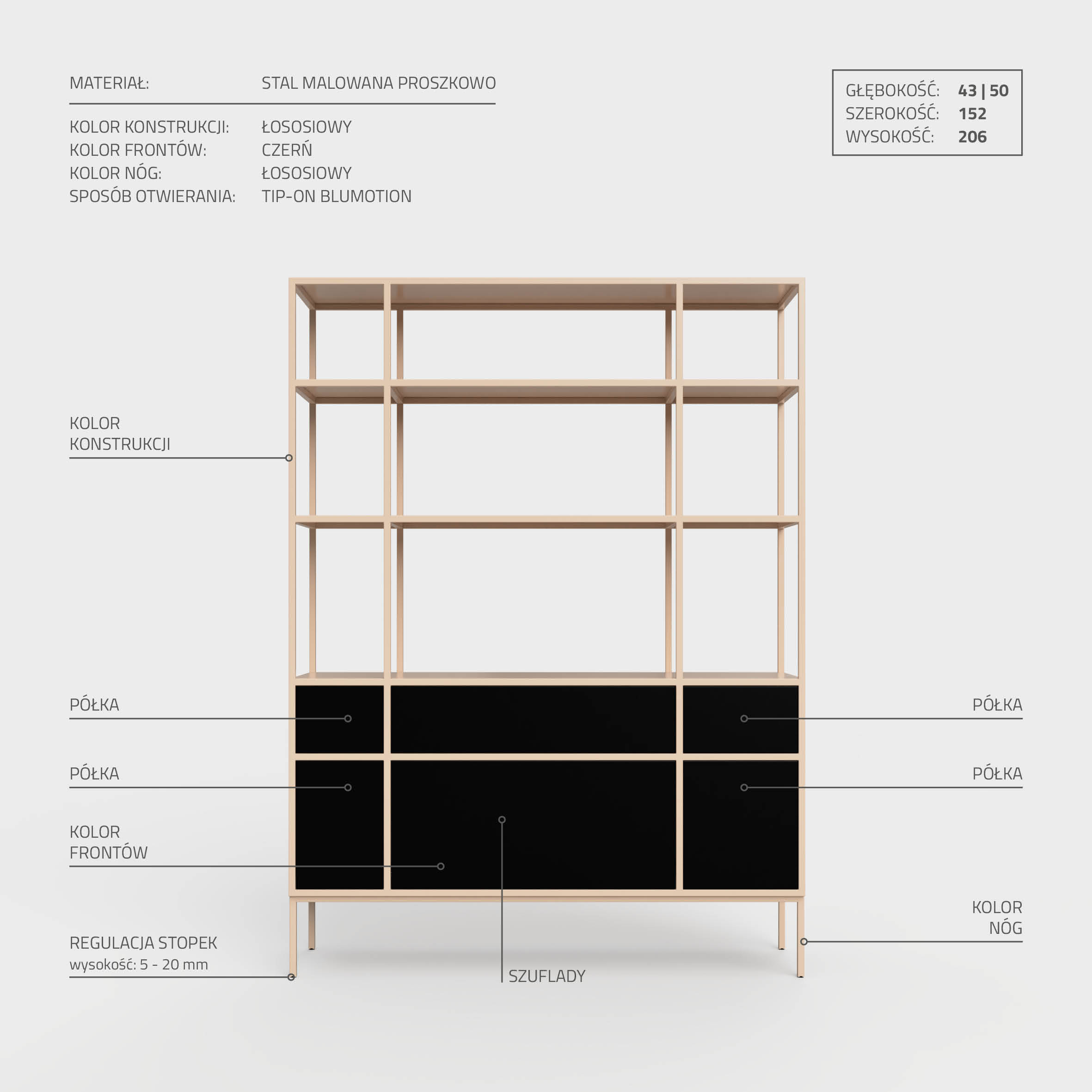 Dbając o swobodny dobór mebli i ich spersonalizowany wygląd, umożliwiamy samodzielny wybór ich kolorów. Zdecyduj się na jeden z 40 dostępnych wariantów kolorystycznych konstrukcji i frontów. Zadbaj o każdy szczegół swojego projektu i wybierz odcień wypełnienia wewnętrznego spośród 8 dostępnych. Szeroka paleta barw pozwala na wybranie zarówno delikatnych, klasycznych barw jak i tych wyraźnych, jaskrawych kolorów. Chcielibyśmy dodać, że do produkcji regału NEOMODERN 01 użyliśmy techniki malowania proszkowego, które zapewnia trwałość koloru i jego wyrazistość przez długie lata.