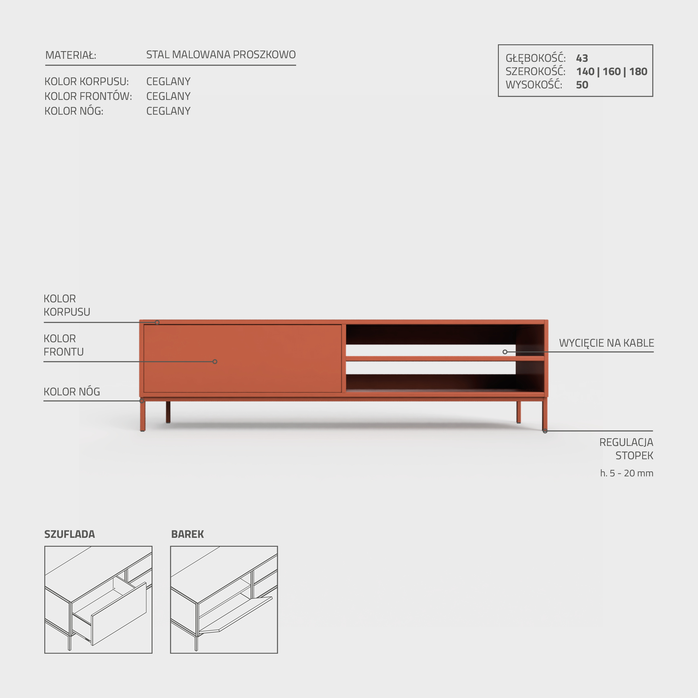Szafka pod RTVPRUNUS 02 to znakomity przykład harmonii pomiędzy nowoczesnym designem a praktycznym zastosowaniem. Jej wymiary, 180 cm x 43 cm, w połączeniu z wysokością 50 cm, gwarantują odpowiednią przestrzeń na Twoje urządzenia multimedialne oraz stylowe dekoracje. Przestronny blat doskonale pomieści zarówno telewizor, jak i ulubione ozdoby. Szafka PRUNUS 02 to nie tylko mebel pod telewizor – to również przestrzeń do wyrażenia Twojej pasji. Minimalistyczny charakter mebla sprawia, że doskonale nadaje się na ekspozycję Twoich winyli i gramofonu, tworząc strefę relaksu w towarzystwie muzyki. W jednej pojemnej szufladzie ukryjesz osobiste drobiazgi, a dwie otwarte półki pomieszczą ulubione książki lub czasopisma.