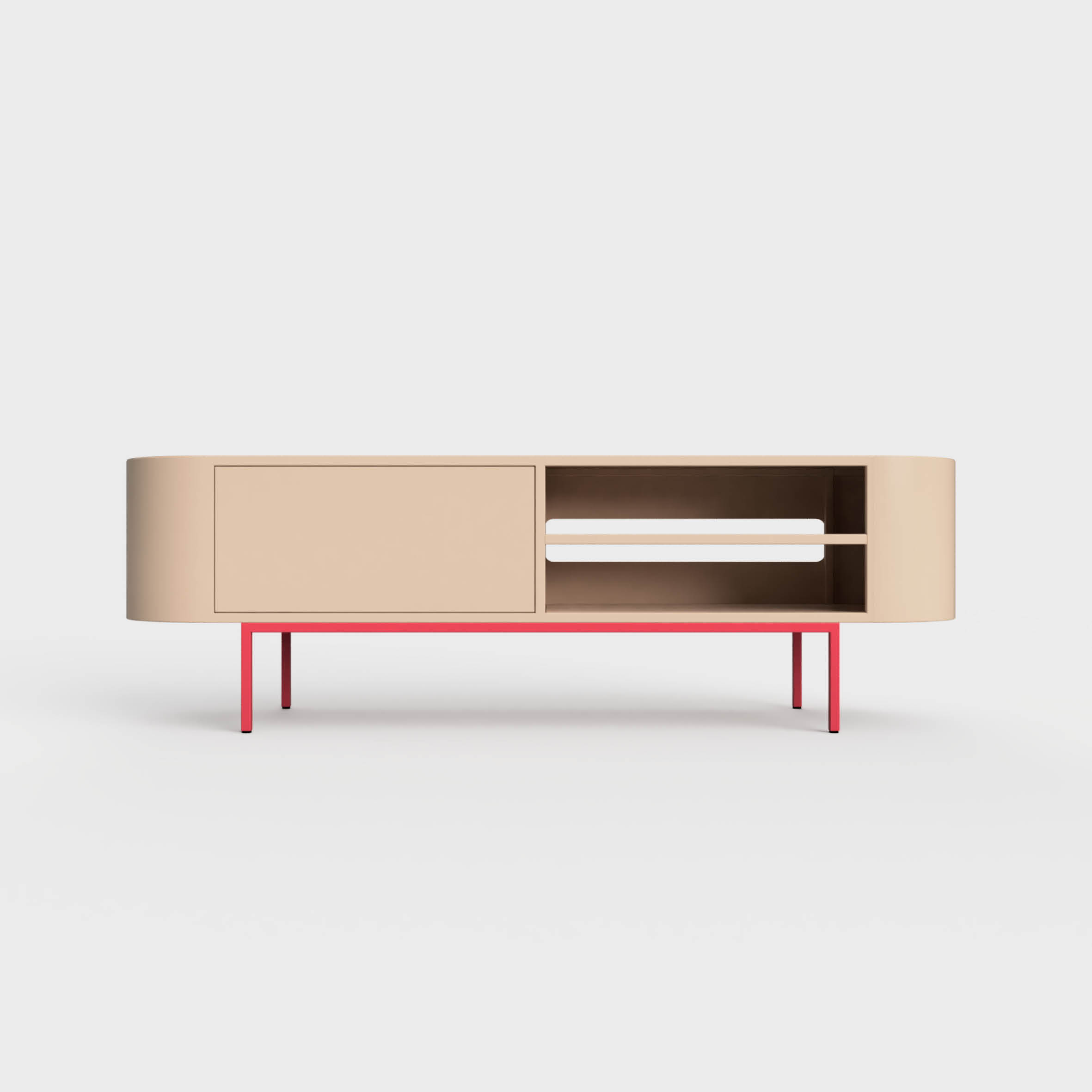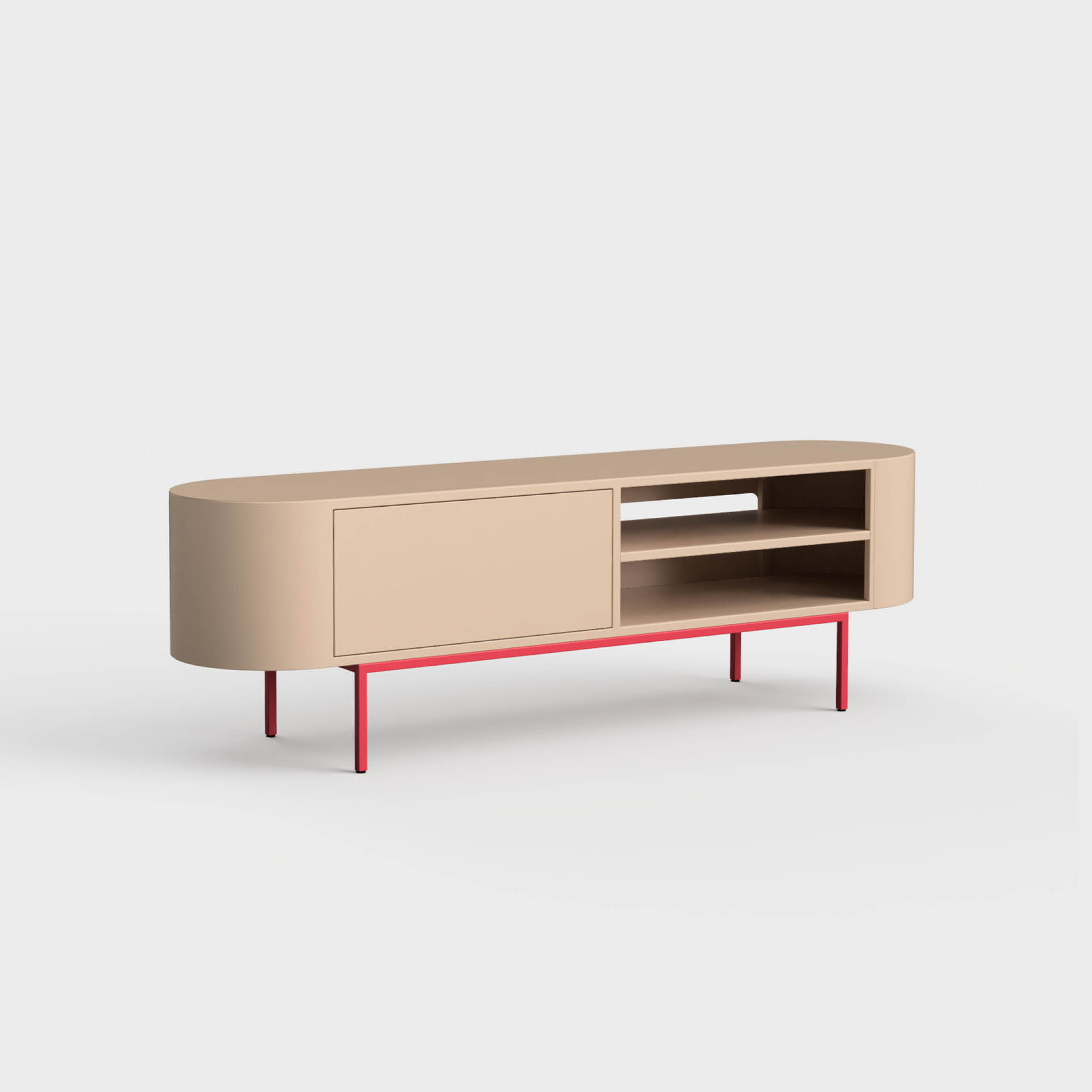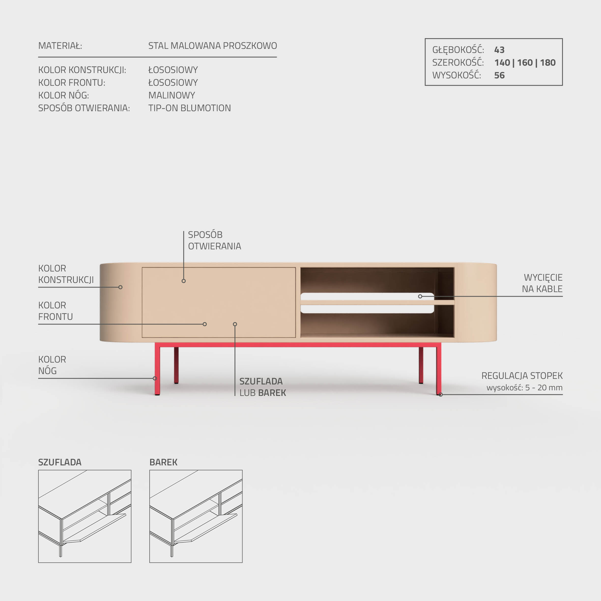 Stojąca komoda pod telewizor o wymiarach 160 cm x 43 cm i wysokości 53 cm, zapewnia obszerny blat, doskonały do eksponowania dekoracji, roślin, fotografii oraz osobistych pamiątek. Funkcjonalność to jej mocna strona – możesz umieścić na niej telewizor oraz sprzęt audio. Pojemne szuflada to doskonałe miejsce na przechowywanie dokumentów i osobistych przedmiotów. Wybór otwierania to kwestia gustu – tradycyjne gałki lub ciche Tip-On z rozwiązaniem BLUM.