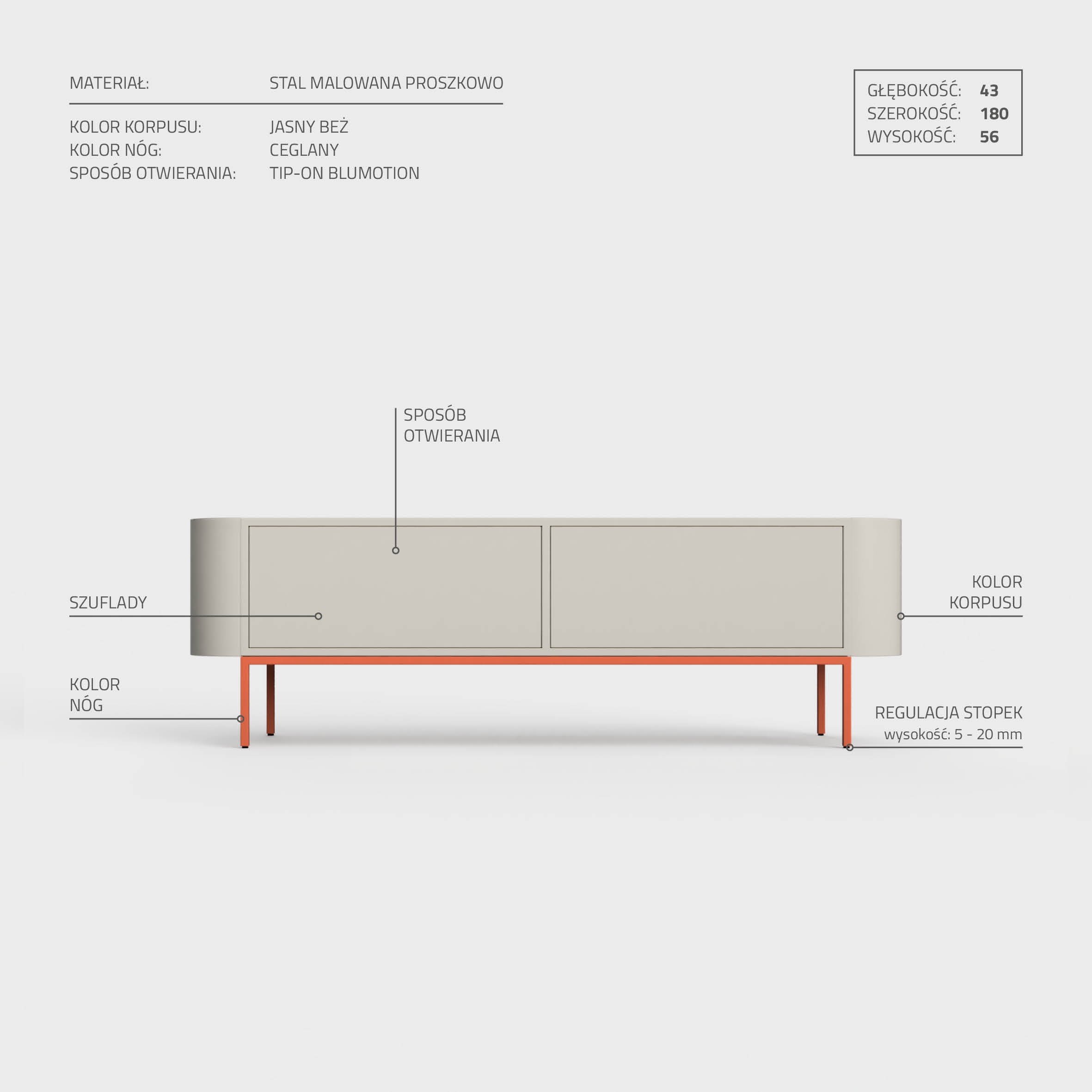 Szafka pod RTV FORMIA 01 od DESIVA daje Ci możliwość pełnej personalizacji kolorystycznej. Wybierz spośród 40 dostępnych opcji odcieni frontów i barw konstrukcji, aby stworzyć mebel idealnie pasujący do Twojego wnętrza. Aż osiem wariantów wypełnienia wewnętrznego szuflad to dodatkowa opcja, z której możesz skorzystać, personalizując FORMIA 01. Technika malowania proszkowego gwarantuje trwałość i intensywność kolorów przez długie lata – Twój mebel nie straci blasku pod wpływem czasu i warunków zewnętrznych.